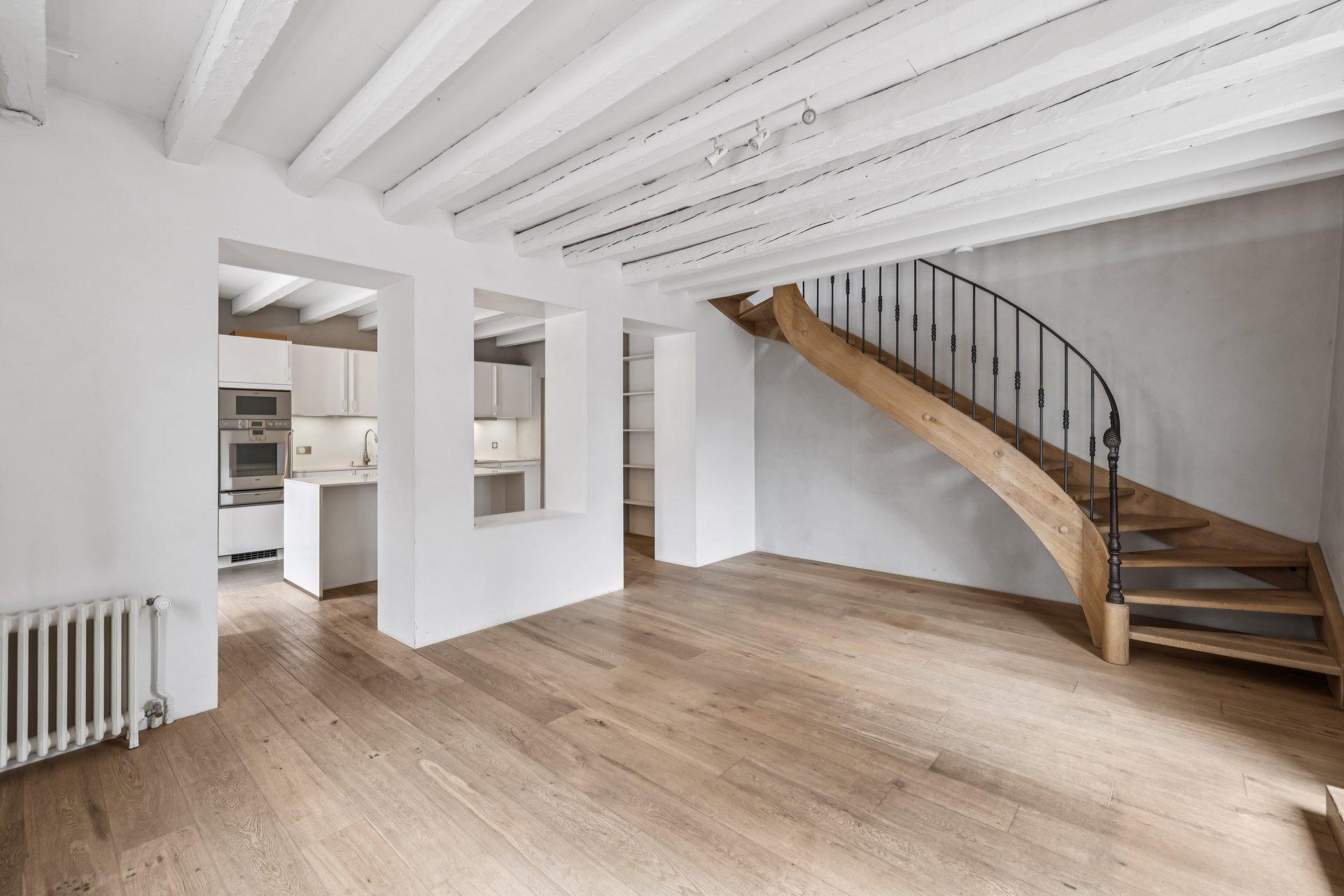 La distribution débute par une cuisine entièrement équipée, ouverte sur une salle à manger conviviale. Un WC visiteur, un coin buanderie ainsi qu’un jardin privatif complètent ce niveau. L’entretien des espaces extérieurs est à la charge entière du locataire.