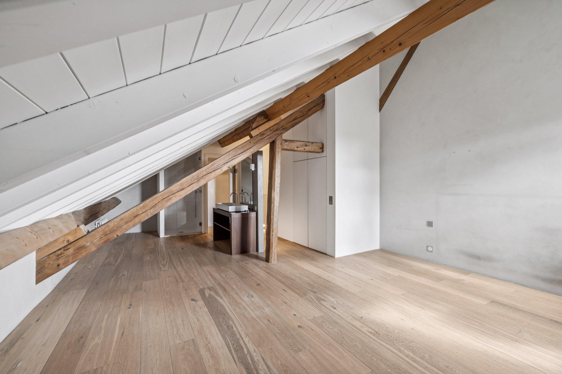 Une chambre parentale sous combles offre un volume généreux avec sa salle d’eau attenante, comprenant douche, double vasque et WC privatif.