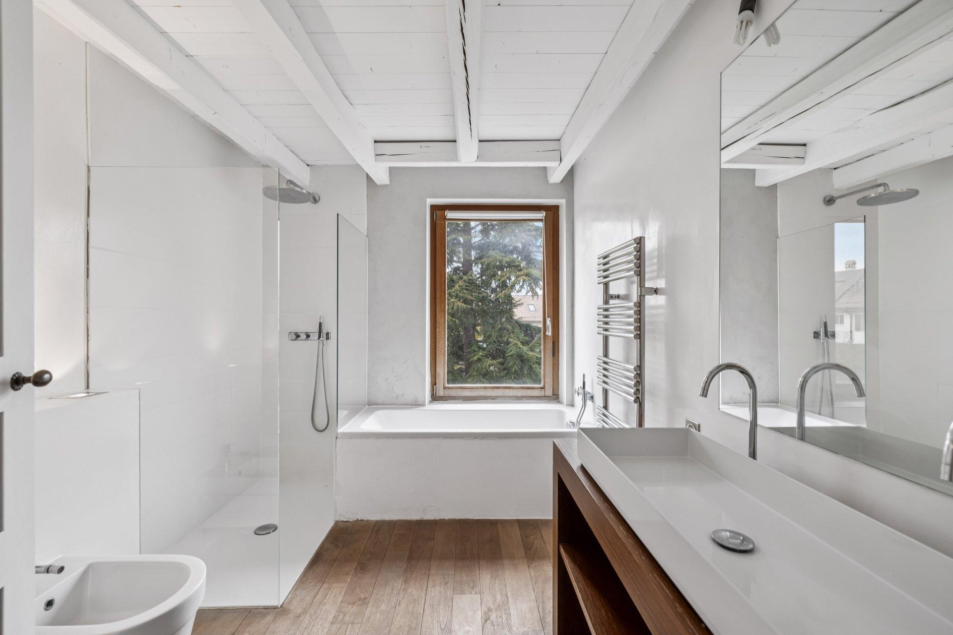L’étage de nuit propose deux chambres, chacune dotée d’armoires encastrées. Une grande salle de bain accueille douche, baignoire, WC, bidet ainsi qu’une vaste vasque double.