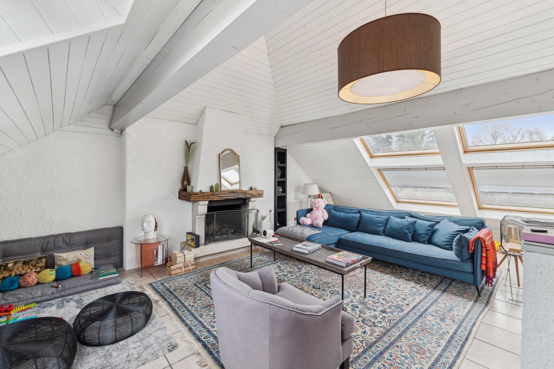 Une spacieuse pièce polyvalente, idéale comme second séjour, bureau ou salle de jeux, baignée de lumière grâce à de nombreux vélux et agrémentée d’une cheminée fonctionnelle apportant chaleur et caractère