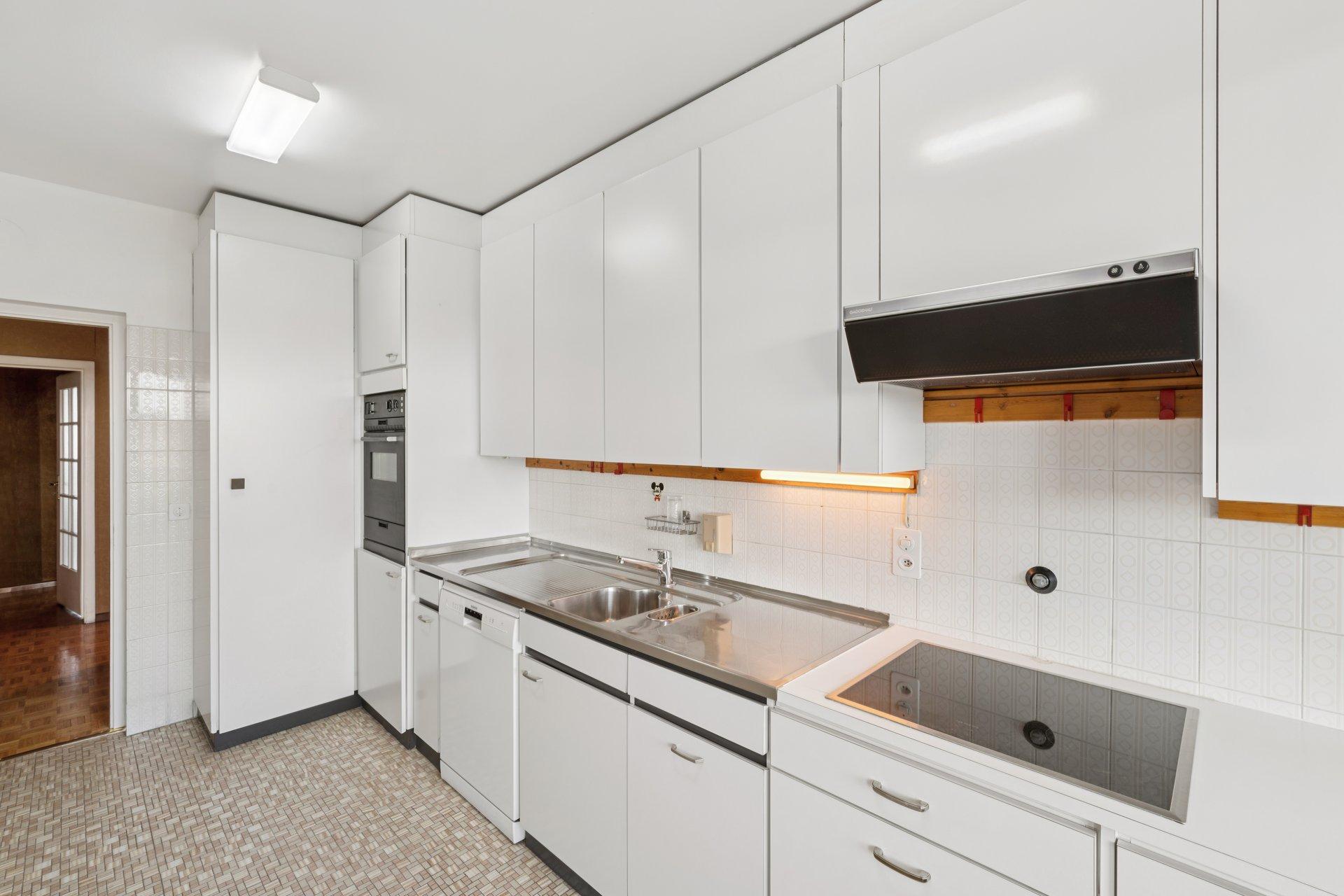 La partie jour se compose d’un vaste hall d’entrée équipé d’une alarme, d’un W.C. visiteurs, d’un beau séjour/salle à manger avec cheminée à bois et accès direct au balcon, ainsi que d’une cuisine d’origine aménagée et équipée.